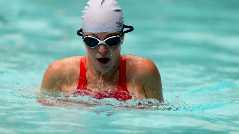 Jenna Fryer da The Associated Press nada usando um Speedo Fastskin LZR Pure Valor 2.0. que será usado por muitos nadadores nas Olimpíadas de Verão de 2024 no Molitor Hotel, quinta-feira, 25 de julho de 2024, em Paris, França. A Speedo permitiu que jornalistas experimentassem o que ela afirma ser o “maiô mais rápido do mundo”. AP Photo / Natacha Pisarenko
