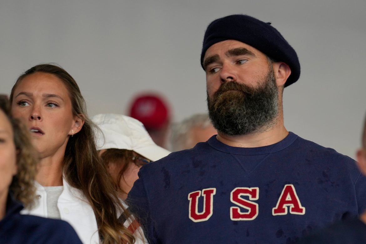 O jogador de linha aposentado do Philadelphia Eagles, Jason Kelce, e sua esposa Kylie assistem à partida de hóquei em campo feminino entre Argentina e Estados Unidos, no Estádio Yves-du-Manoir, nas Olimpíadas de Verão de 2024, sábado, 27 de julho de 2024, em Colombes, França. (Foto AP/Anjum Naveed) APPA-AP