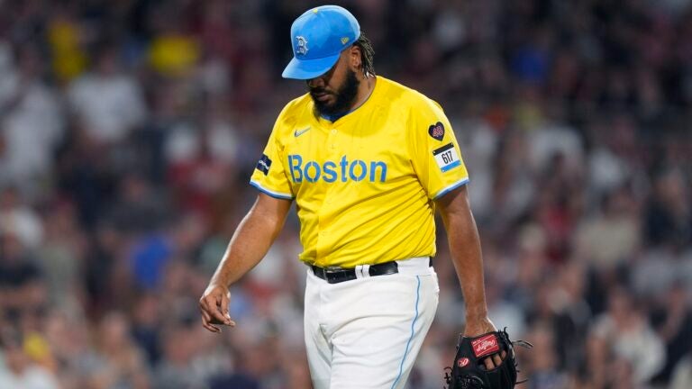 Kenley Jansen permitiu duas rebatidas em uma defesa desperdiçada na derrota do Red Sox para o Yankees. (Foto AP/Michael Dwyer)