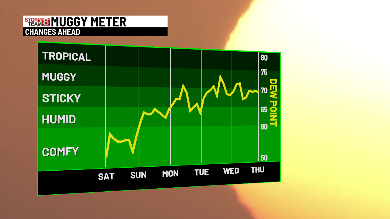 A umidade volta, então também será muito mais desconfortável na maior parte da semana. Também haverá algumas chances de chuvas/tempestades durante a semana. Nenhuma erosão parece provável até agora, o que é bom.