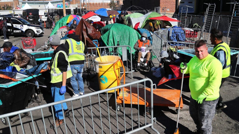 Trabalhadores limpando tendas na Atkinson Street em outubro de 2023. John Tlumacki/Boston Globe