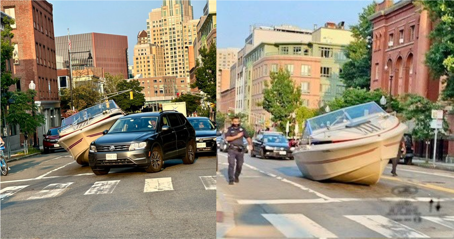 O Departamento de Polícia de Cambridge teve que fechar as ruas Cambridge e Third depois que um barco ficou preso no meio do trânsito.
