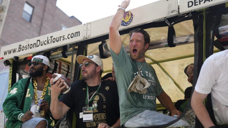 O fundador da Barstool Sports, Dave Portnoy, homenageia os Celtics durante um desfile de barcos para celebrar o 18º campeonato da NBA do Boston Celtics em 21 de junho de 2024. Kayla Bartkowski para o Boston Globe Kayla Bartkowski para o Boston Globe