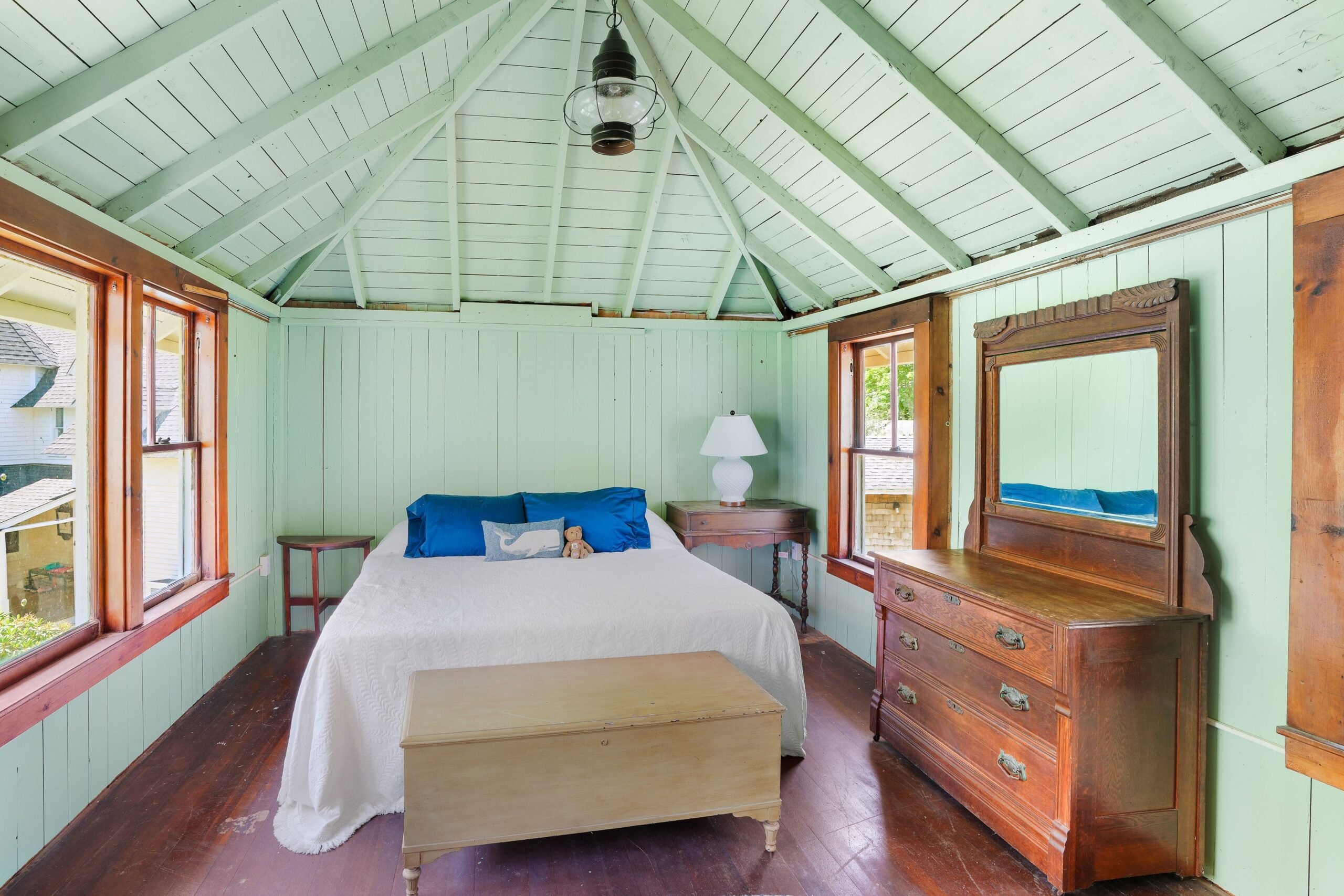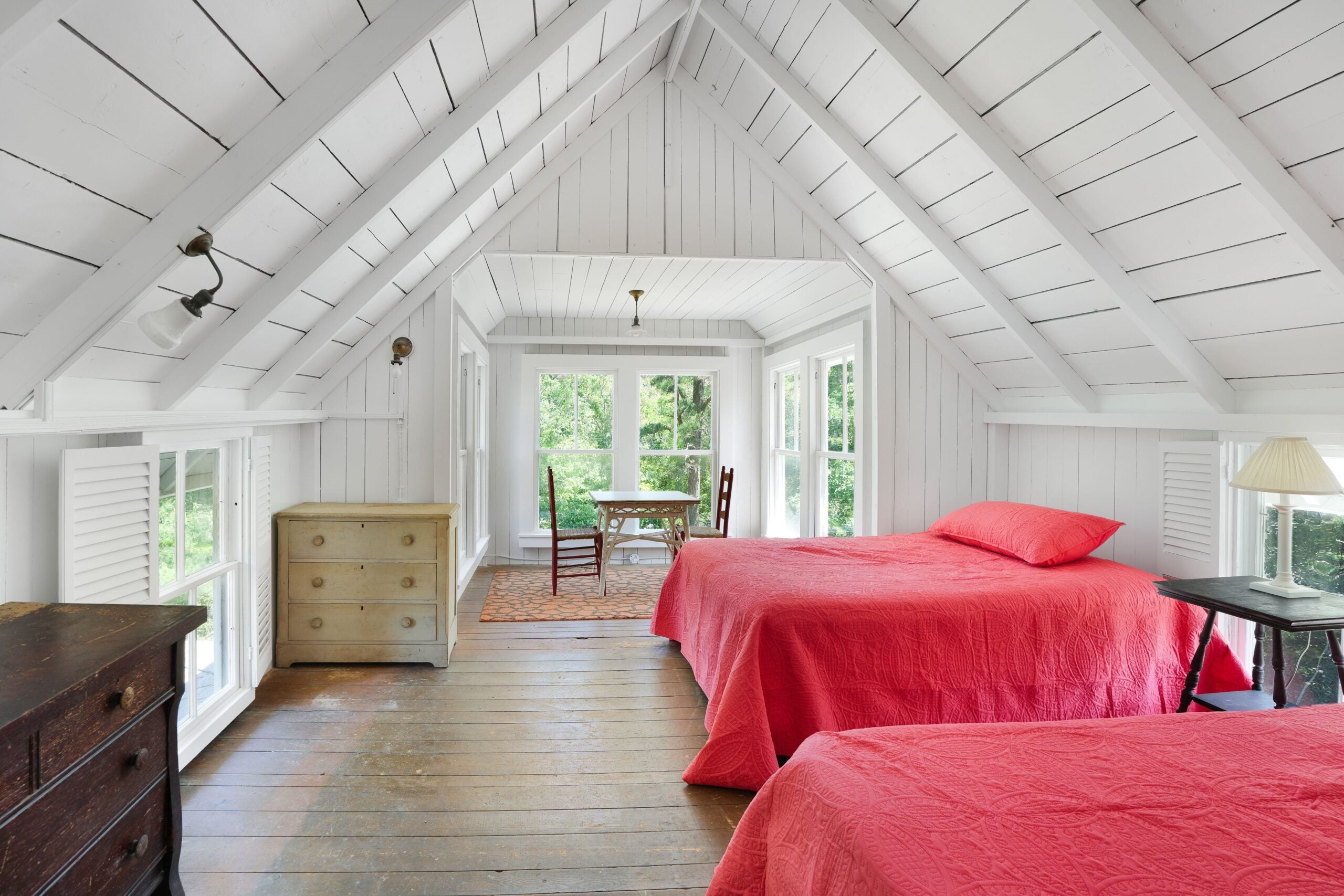 Os quatro quartos ficam no segundo andar. O principal é o maior (291 pés quadrados) e inclui uma saliência com janela. O piso é de madeira, e as paredes e o teto com vigas expostas são pintados de branco.