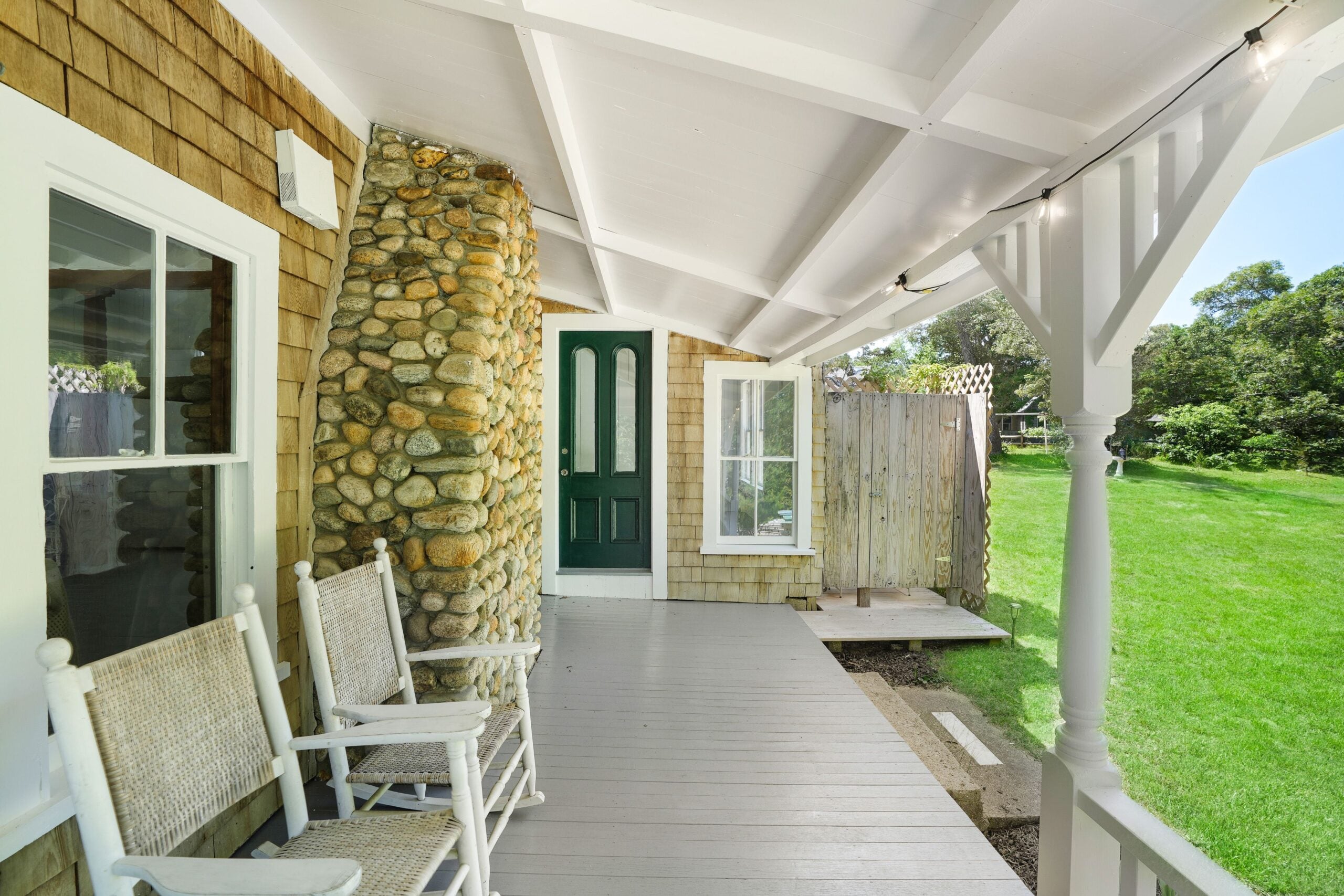 Nesta propriedade em Martha's Vineyard, a entrada de tijolos vermelhos termina em uma garagem separada de 209 pés quadrados, mas é muito mais agradável ir pela calçada. Vá para a varanda envolvente cruzando o gramado da frente em um caminho de pedras. A varanda, que abrange a largura da casa, tem colunas adornadas com suportes arquitetônicos. A chaminé de pedra da praia, que se projeta através da varanda, também é um atrativo visual.