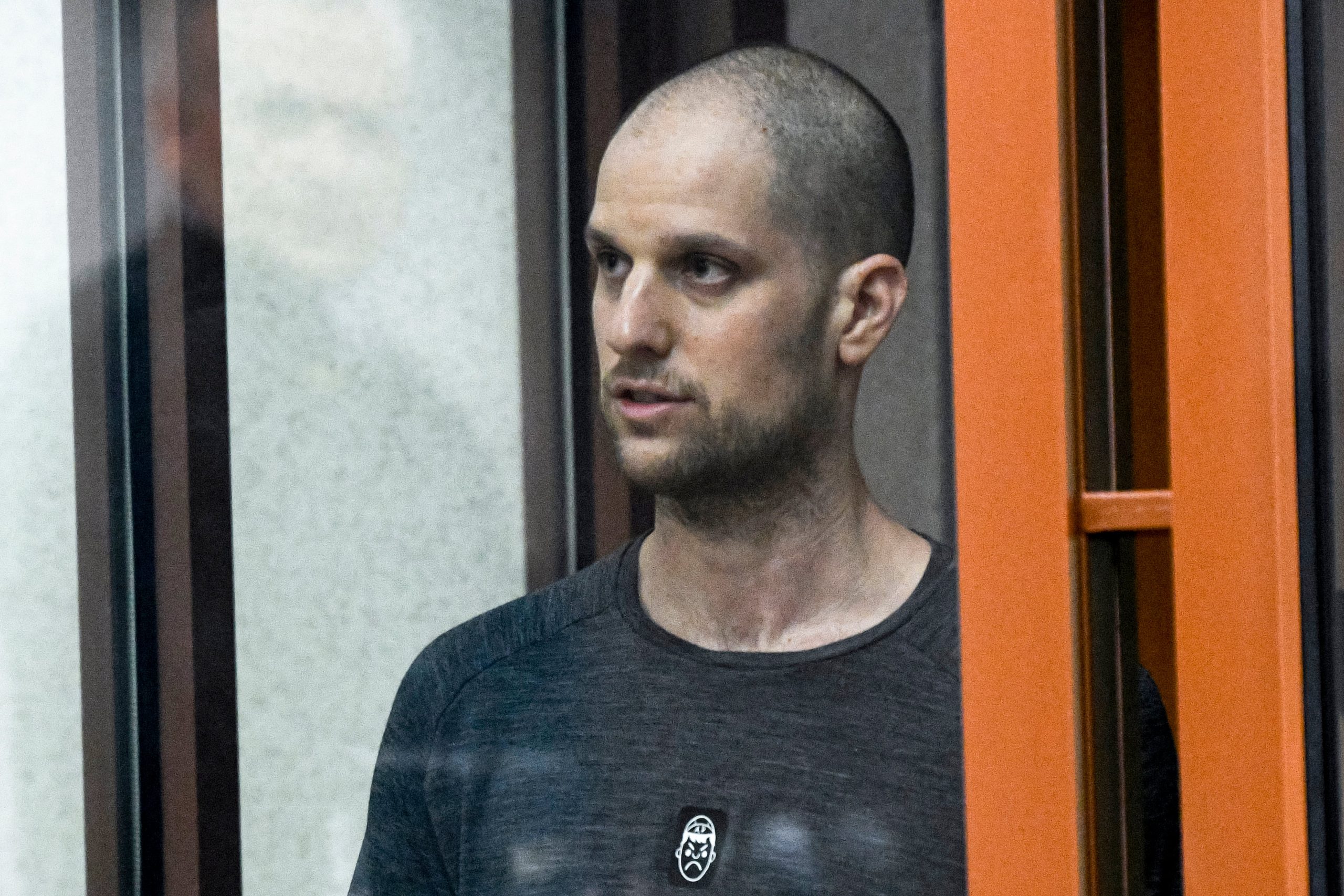 As his trial started behind closed doors on June 26, Gershkovich stood in the defendants cage with a shaved head as the media were allowed briefly into the court.