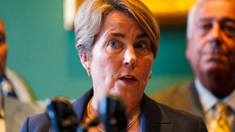 A governadora Maura Healey discursa após assinar o orçamento do ano fiscal de 2025 na Massachusetts State House, em Boston. Kayla Bartkowski para o Boston Globe
