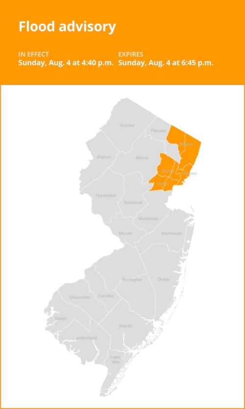 O Serviço Nacional de Meteorologia emitiu um alerta de inundação atualizado às 16h40 de domingo, com validade até 18h45 para os condados de Bergen, Essex, Hudson e Union.