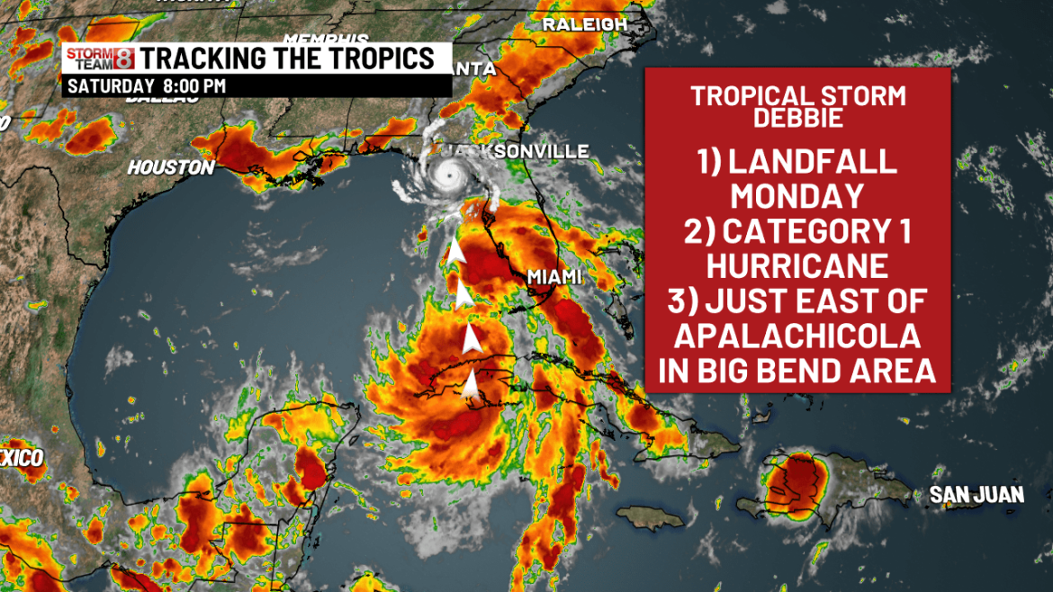 Estamos monitorando a previsão de que a tempestade tropical Debby se tornará um furacão em direção à área de Big Bend, na Flórida, na segunda-feira e depois seguirá para a costa leste no final da semana que vem!!