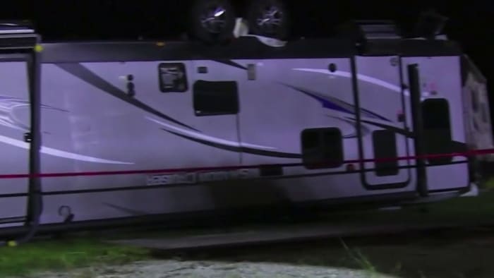 Moradores dizem que cinco campistas viraram, com uma pessoa dentro de um deles quando ele virou. A vítima foi levada para um hospital local, mas as autoridades não divulgaram a gravidade dos ferimentos da pessoa.