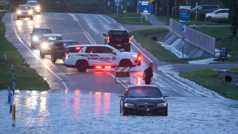 Um sedã BMW está parado em águas altas ao longo da rodovia US Alt 19 em direção ao sul em Tarpon Springs, Flórida, na manhã de segunda-feira, 5 de agosto de 2024, enquanto o furacão Debby passa pela área da Baía de Tampa, na costa. Douglas R. Clifford/Tampa Bay Times via AP