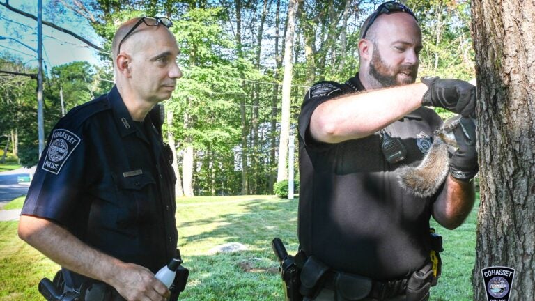 O Departamento de Polícia de Cohasset respondeu a um relato de uma cabeça de esquilo presa dentro de uma árvore na Brewster Road na segunda-feira.