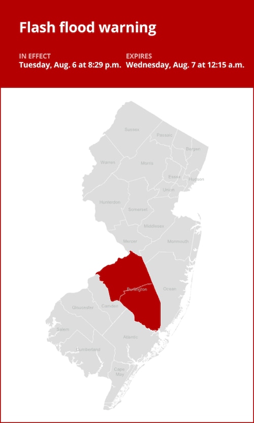 Na terça-feira, às 20h29, um alerta atualizado de inundação repentina foi emitido pelo Serviço Nacional de Meteorologia, com vigência até quarta-feira, à meia-noite e 15h para o Condado de Burlington.