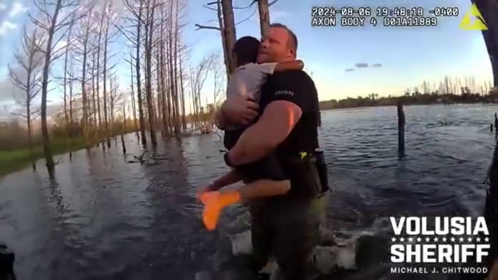 CONDADO DE VOLUSIA, Flórida. – O Gabinete do Xerife do Condado de Volusia divulgou imagens de uma câmera corporal mostrando um policial resgatando uma criança de um lago em Deltona na terça-feira à noite.