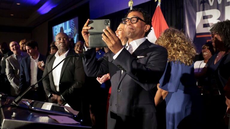 Wesley Bell grava um vídeo de seus apoiadores enquanto sobe ao palco como vencedor das primárias democratas do Congresso contra a atual deputada federal Cori Bush na terça-feira, 6 de agosto de 2024, em St. Louis. Robert Cohen/St. Louis Post-Dispatch via AP
