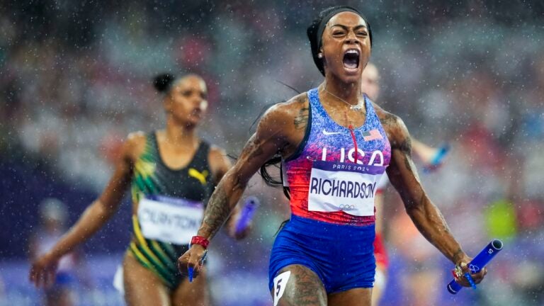 Richardson, que ganhou a prata nos 100 metros no último final de semana, saltou do terceiro para o primeiro lugar na etapa principal para levar os Estados Unidos à vitória na sexta-feira, e depois teve um lugar na primeira fila para assistir os homens dos EUA estenderem sua sequência para 20 anos sem medalhas nos Jogos.