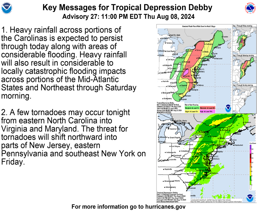 Observando o que sobrou de Debby hoje e hoje à noite! Chuvas e tempestades passageiras hoje com umidade muito mais alta! Clima ruim se desenvolvendo esta noite e hoje à noite, com faixas de chuva forte e tempestades se movendo combinadas com ventos crescentes do sul de 30-45 MPH. há um Alerta de Vento para o litoral. Algumas tempestades podem ser severas com um Aviso de Tornado possível também! Mantenha seu telefone carregado e por perto. Todo esse clima ativo se afasta logo de manhã amanhã e o clima agradável se instalará na maior parte do sábado e todo o domingo. Grande parte da próxima semana parece tranquila. Pode haver outro sistema tropical perto da Costa Leste em torno de uma semana a partir de agora.