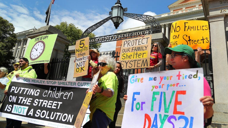 Em 8 de agosto, a Massachusetts Coalition for the Homeless e o Massachusetts Law Reform Institute realizaram um protesto em frente à casa do estado em resposta às novas políticas que limitam a permanência em abrigos. John Tlumacki/Boston Globe