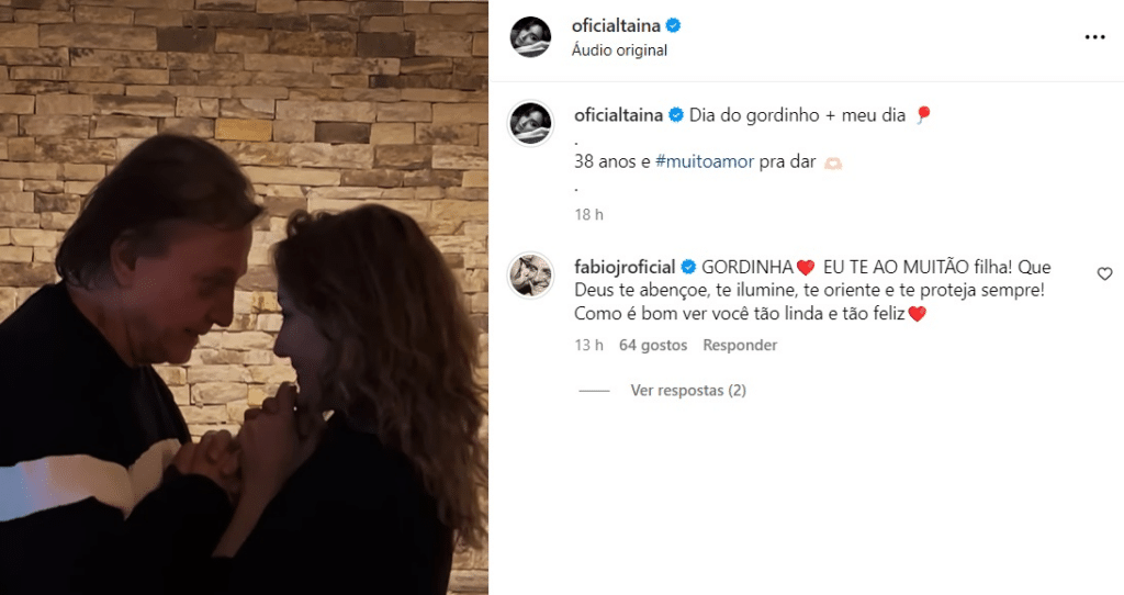 Na madrugada de terça-feira, 13 de agosto de 2024, Tainá Galvão continuou a celebração ao compartilhar outro vídeo, desta vez uma retrospectiva dos momentos mais significativos de sua vida. A resposta de Fábio Jr. não poderia ser diferente: “Parabéns, gordinha. Te amo muitão”, reafirmando o carinho e a proximidade entre pai e filha.