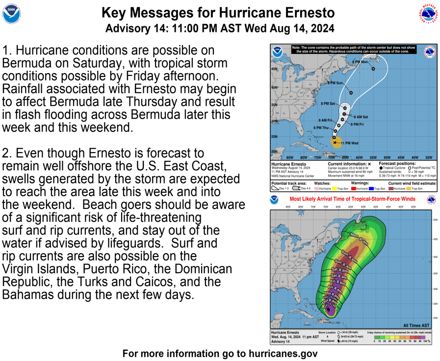 Ernesto será um grande furacão de categoria 3 passando muito perto das Bermudas na sexta-feira à noite e no início do sábado. Não é esperado que chegue à costa ao longo da Costa Leste, mas é aconselhável extremo cuidado nas praias de oceano aberto de NJ, NY, RI, MA, NH e ME para ondas enormes e correntes de retorno perigosas/mortais!