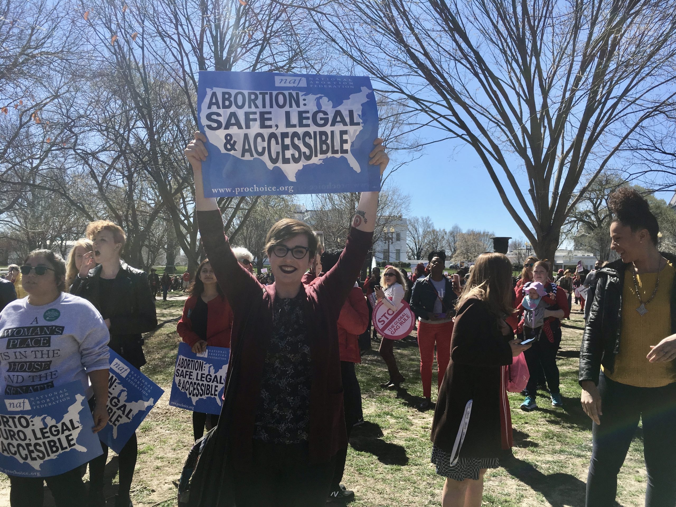 Mulher em protesto pelos direitos ao aborto segurando uma placa que diz “Aborto: seguro, legal e acessível”. | Federação Nacional do Aborto