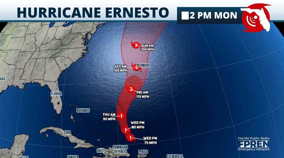 Ernesto está em uma área favorável para continuar se fortalecendo e provavelmente atingirá o status de furacão principal até sexta-feira. Até então, Ernesto provavelmente flutuará em direção, movendo-se principalmente para o norte e para longe dos EUA continentais.