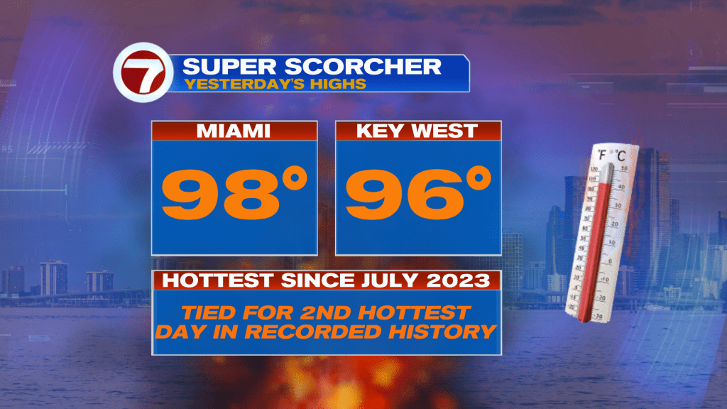 Isso segue o calor recorde no sul da Flórida, onde Miami e Key West atingiram 98F e 96F, respectivamente. Isso fez com que fosse a temperatura mais quente em mais de um ano e empatou com a 2ª temperatura mais quente na história registrada para ambas as cidades.