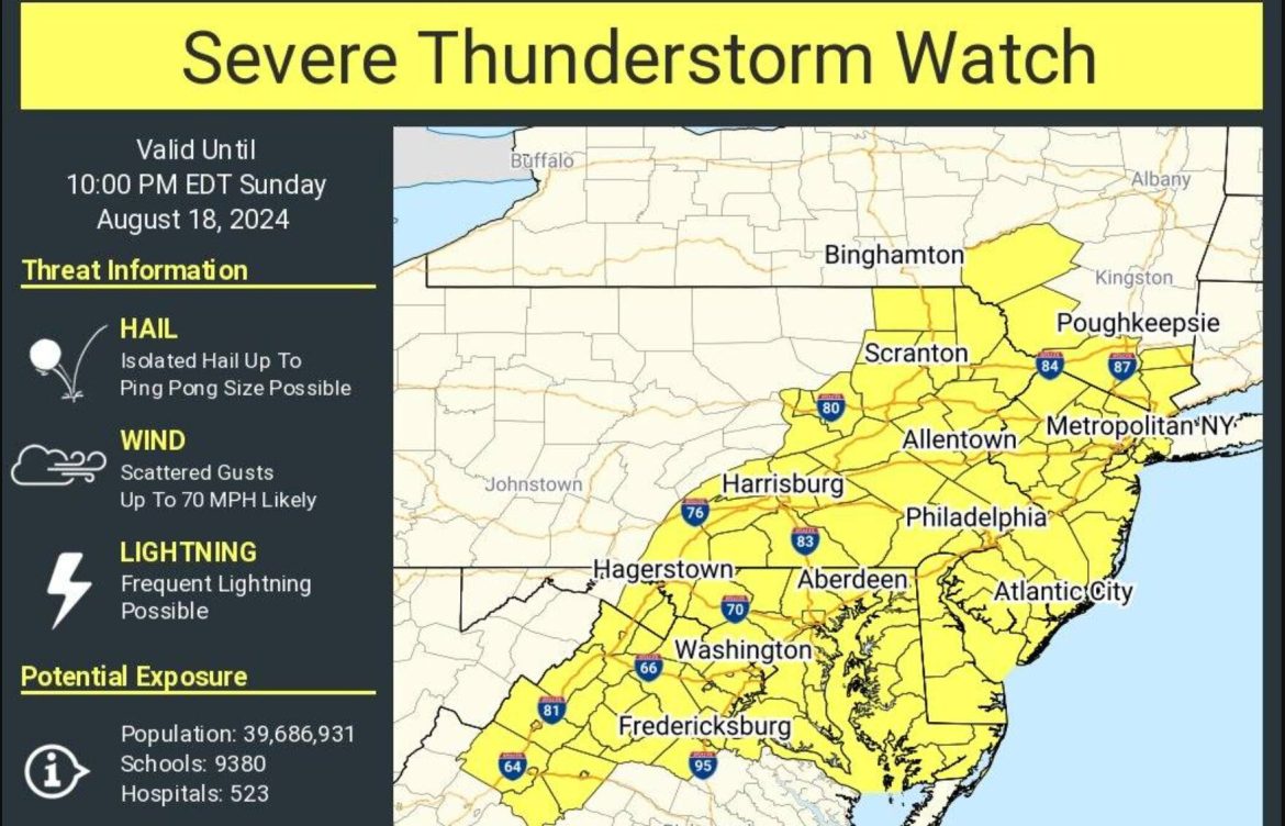 O National Weather Service emitiu o alerta logo após as 14h de domingo. Ele estará em vigor até as 22h. O alerta de tempestade severa inclui partes de Nova Jersey e várias outras regiões ao longo da costa leste.