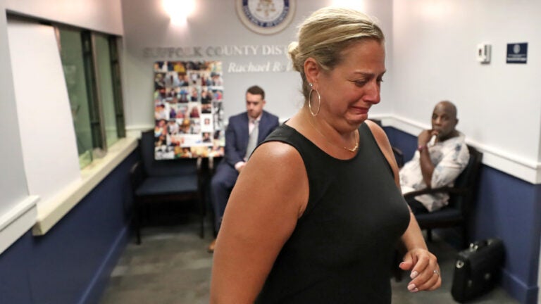 Lynnel Cox, mãe de Shayne Stilphen, que foi confrontar a então promotora Rachel Rollins em seu escritório, se afasta de algumas fotos de seu filho espalhadas pelo saguão do escritório do promotor em julho de 2019. David L. Ryan/Globe Staff, Arquivo