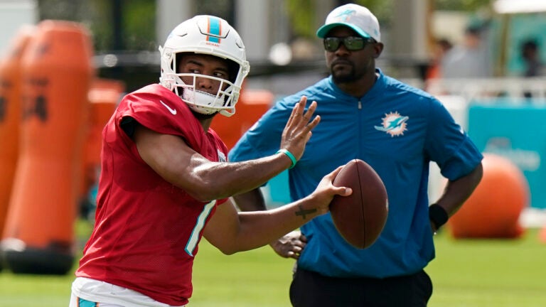 Tua Tagovailoa e Brian Flores em agosto de 2021. AP Photo/Wilfredo Lee