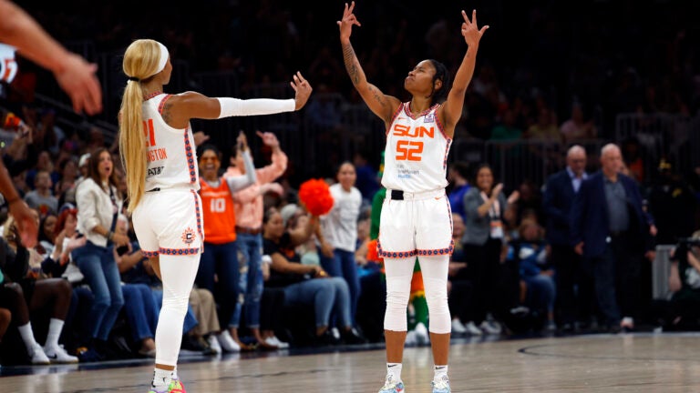 A ala do Connecticut Sun, Tyasha Harris (52), reage com o ala DiJonai Carrington (21) depois que Harris acerta uma cesta de três pontos para encerrar o primeiro tempo no TD Garden. Danielle Parhizkaran / Equipe Globe