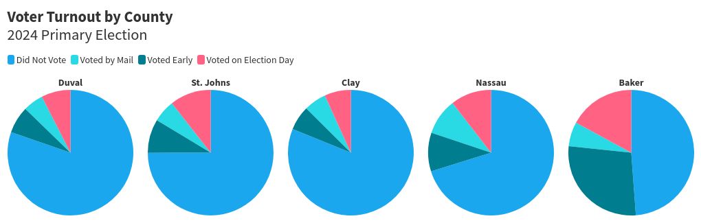 Os condados de Duval e Clay tiveram menos de 20% de seus eleitores registrados votando nas eleições primárias. St. Johns e Nassau pontuaram um pouco melhor – 25,1% e 29,8%, respectivamente. O Condado de Baker, no entanto – um condado com menos eleitores totais do que o total combinado dos três distritos mais populosos de Duval – atraiu mais da metade de seus eleitores.