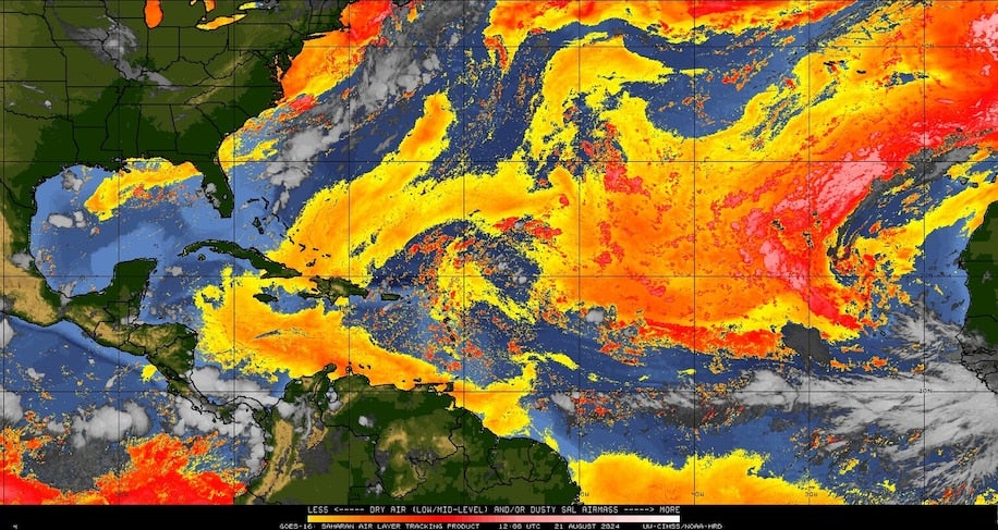 • Poeira do Saara. A SAL, ou Camada de Ar Saariana, levou ao ar quente, seco e empoeirado flutuando sobre o Atlântico tropical oriental. Isso coloca uma tampa em tempestades incipientes e inibe o desenvolvimento.