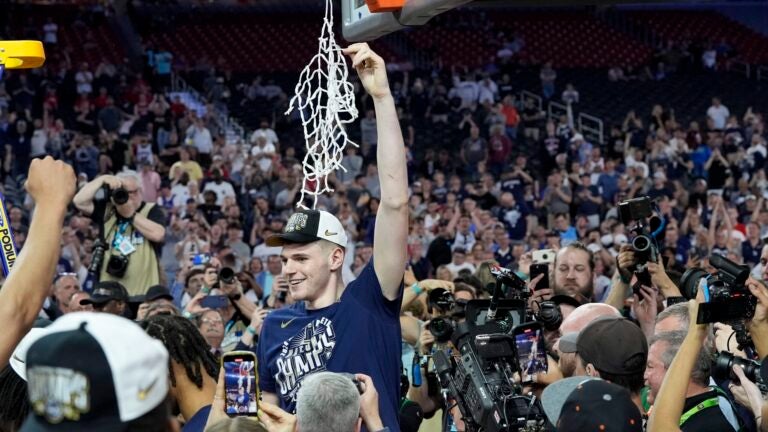 O pivô da UConn, Donovan Clingan, comemora o corte da rede após a vitória contra Purdue no jogo do campeonato de basquete universitário Final Four da NCAA, em 8 de abril de 2024. AP Photo/David J. Phillip, Arquivo