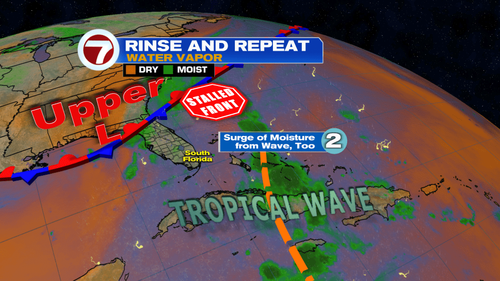 A partir desta sexta-feira, a onda tropical está localizada sobre Cuba e Bahamas e continua a seguir em direção ao oeste. Isso atrairá mais umidade ao longo do fim de semana, levando a chances de chuva moderadas a altas com 60% de chance.