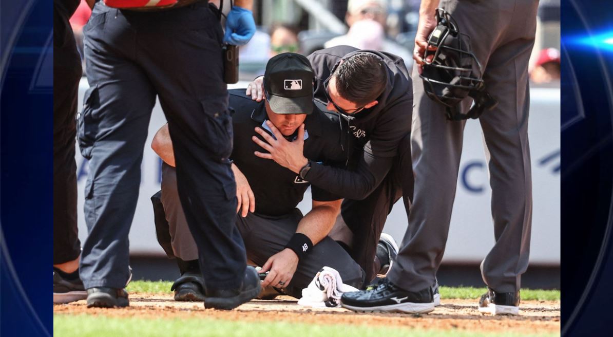 (CNN) — O árbitro da base Nick Mahrley foi retirado do campo em uma maca após ser atingido na cabeça por um taco quebrado no domingo, durante o quinto inning do jogo entre o anfitrião New York Yankees e o Colorado Rockies.