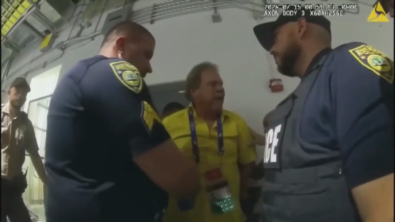 A altercação verbal acabou se tornando física, com um guarda colocando a “palma da mão aberta” no peito de Jesurún Jr. para “guiá-lo de volta” e o Jesurún mais jovem agarrando o guarda “pelo pescoço” e puxando-o para o chão antes de dar “dois socos que atingiram” o guarda, disse o relatório de prisão.