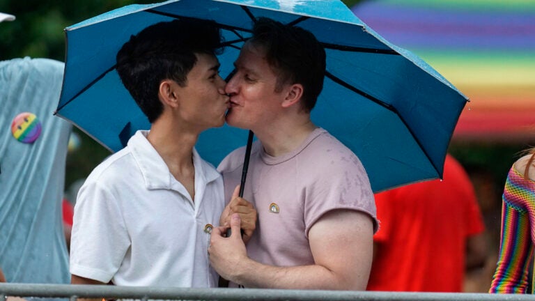 Jon Batayola, à esquerda, e Daniel Biginton se abraçam sob um guarda-chuva enquanto aguardam o início da Parada do Orgulho anual de Chicago, em 25 de junho de 2023. AP Photo/Erin Hooley, arquivo