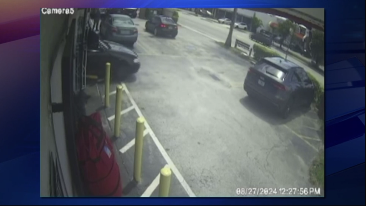 MIAMI (WSVN) – Um carro supostamente dirigido por uma mulher idosa foi flagrado batendo de ré na fachada de uma loja e depois indo embora derrubando uma placa de rua em Miami.
