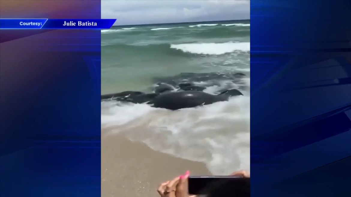 SUNNY ISLES BEACH, FL. (WSVN) – Peixes-boi se encontraram na costa de Sunny Isles Beach, atraindo banhistas curiosos.