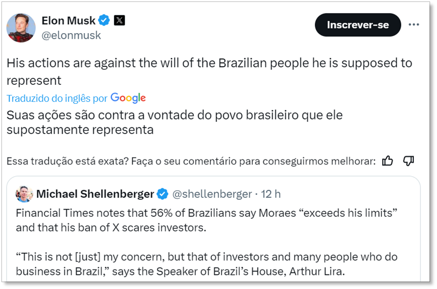 Moraes determinou a suspensão do X no Brasil. No entanto, brasileiros que estão no exterior seguem com acesso normal à plataforma. Foi desta maneira que este jornal digital leu as mensagens postadas pelo empresário e replica neste texto, por ser de interesse público e ter relevância jornalística.
