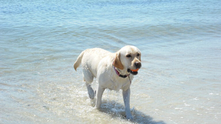 Roxie emerge do oceano com sua bola na praia de West Dennis, no dia seguinte ao Dia do Trabalho. Beth Treffeisen