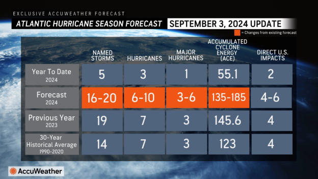 O AccuWeather agora prevê de 16 a 20 tempestades nomeadas, de seis a 10 furacões, de três a seis grandes furacões e de quatro a seis impactos diretos nos Estados Unidos.
