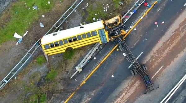 Um caminhão basculante atingiu o ônibus por trás, arrancando a carroceria do chassi e ferindo todas as pessoas a bordo.