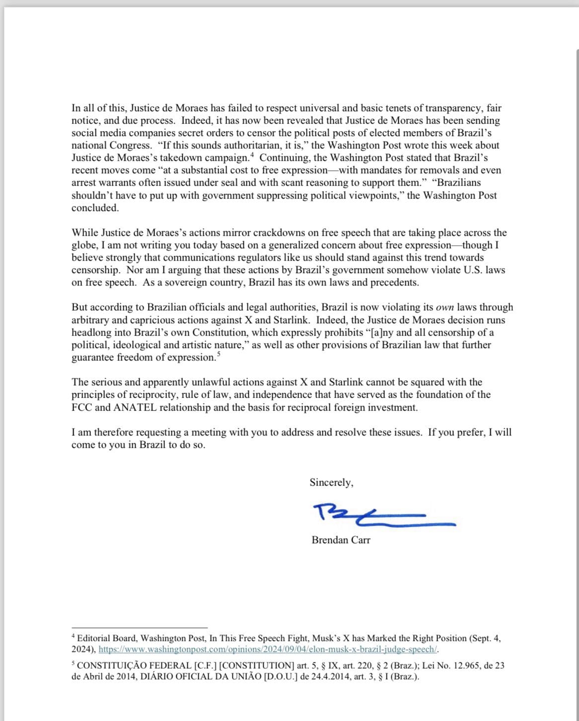 Brendan Carr argumentou que a decisão da Anatel de mandar as operadoras bloquearem o Twitter/X viola a Constituição do Brasil. Ele ainda criticou o congelamento de ativos da Starlink por ordem de Alexandre de Moraes, porque a empresa, embora pertença ao empresário Elon Musk, possui seus próprios acionistas. Não há relação da Starlink com o Twitter/X, o que tornaria ilegal a decisão do ministro do Supremo.