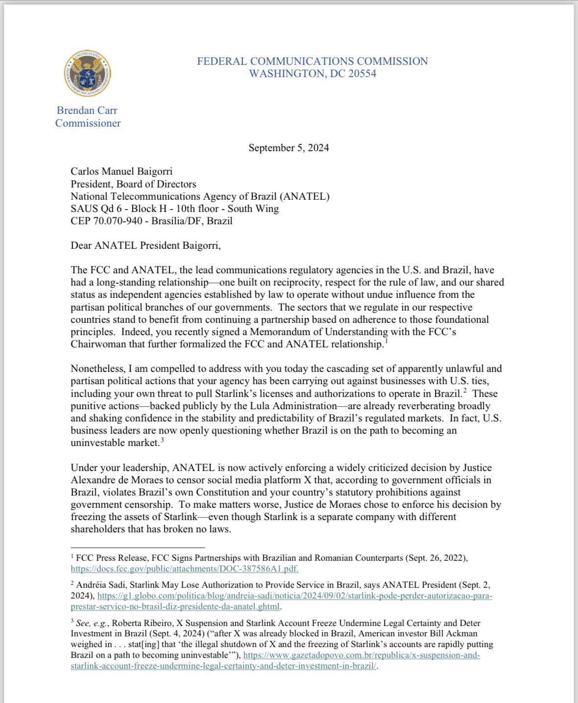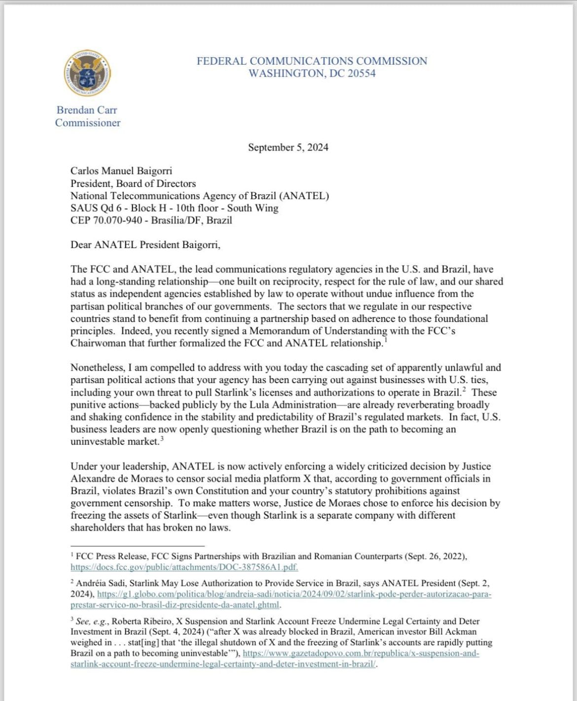 O chefe da Comissão Federal de Comunicação dos Estados Unidos, Brendan Carr, enviou uma carta ao presidente da Agência Nacional de Telecomunicações (Anatel), Carlos Baigorri, para repudiar a decisão do órgão regulador de acatar as ordens do ministro Alexandre de Moraes, do Supremo Tribunal Federal (STF), que culminaram no bloqueio do Twitter/X no Brasil.