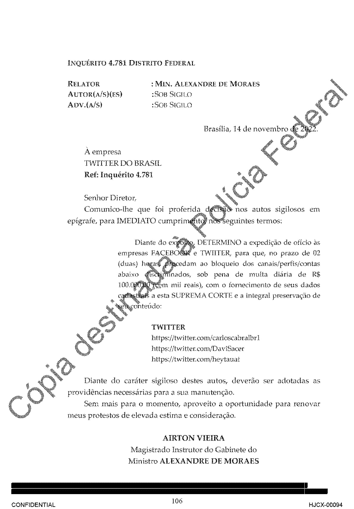 Oeste teve acesso ao teor da postagem por meio de um colaborador, que reside nos Estados Unidos. A determinação de Moraes foi enviada ao Twitter/X em 14 de novembro de 2022.