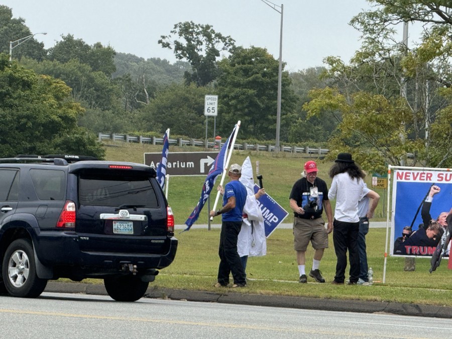 Motoristas que passavam por ali relataram que o grupo carregava cartazes com mensagens vulgares. Fotos do comício mostram um homem em vestes brancas com um capuz branco pontudo cobrindo seu rosto segurando um cartaz que dizia “Trump Endossado pela KKK!”.