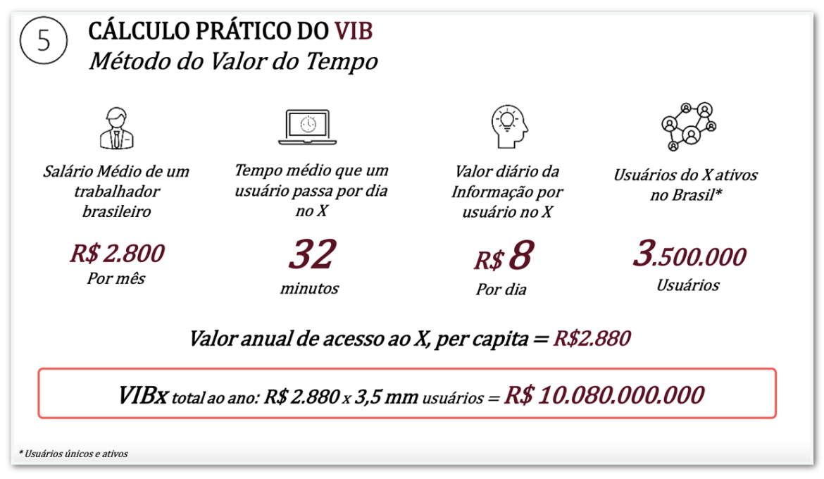 Também considerou que a rede social tinha 14 milhões de usuários brasileiros frequentes. Para a conta, no entanto, ele usou 25% desse número (3,5 milhões). O argumento dado pelo economista é de que prefere “errar para baixo do que para cima”.