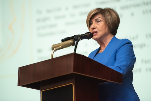 A superintendente das escolas de Jersey City, Norma Fernandez, fala em uma reunião de líderes distritais antes do ano letivo na Ferris High School em 20 de agosto de 2024. Reena Rose Sibayan | The Jersey JournalReena Rose Sibayan | A Jersey
